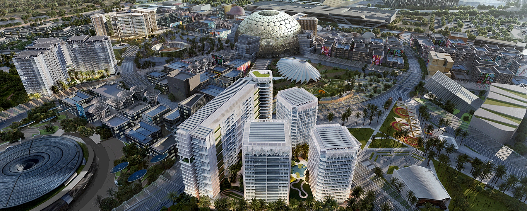 With government support, the masterplan of Expo City envisions a city of the future, integrating cutting-edge technology and green spaces.